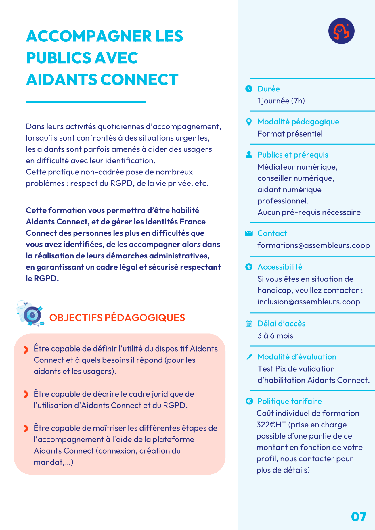 Objectifs de la formation : Cette formation vous permettra d’être habilité Aidants Connect, et de gérer les identités France Connect des personnes les plus en difficultés que vous avez identifiées, de les accompagner alors dans la réalisation de leurs démarches administratives, en garantissant un cadre légal et sécurisé respectant le RGPD.