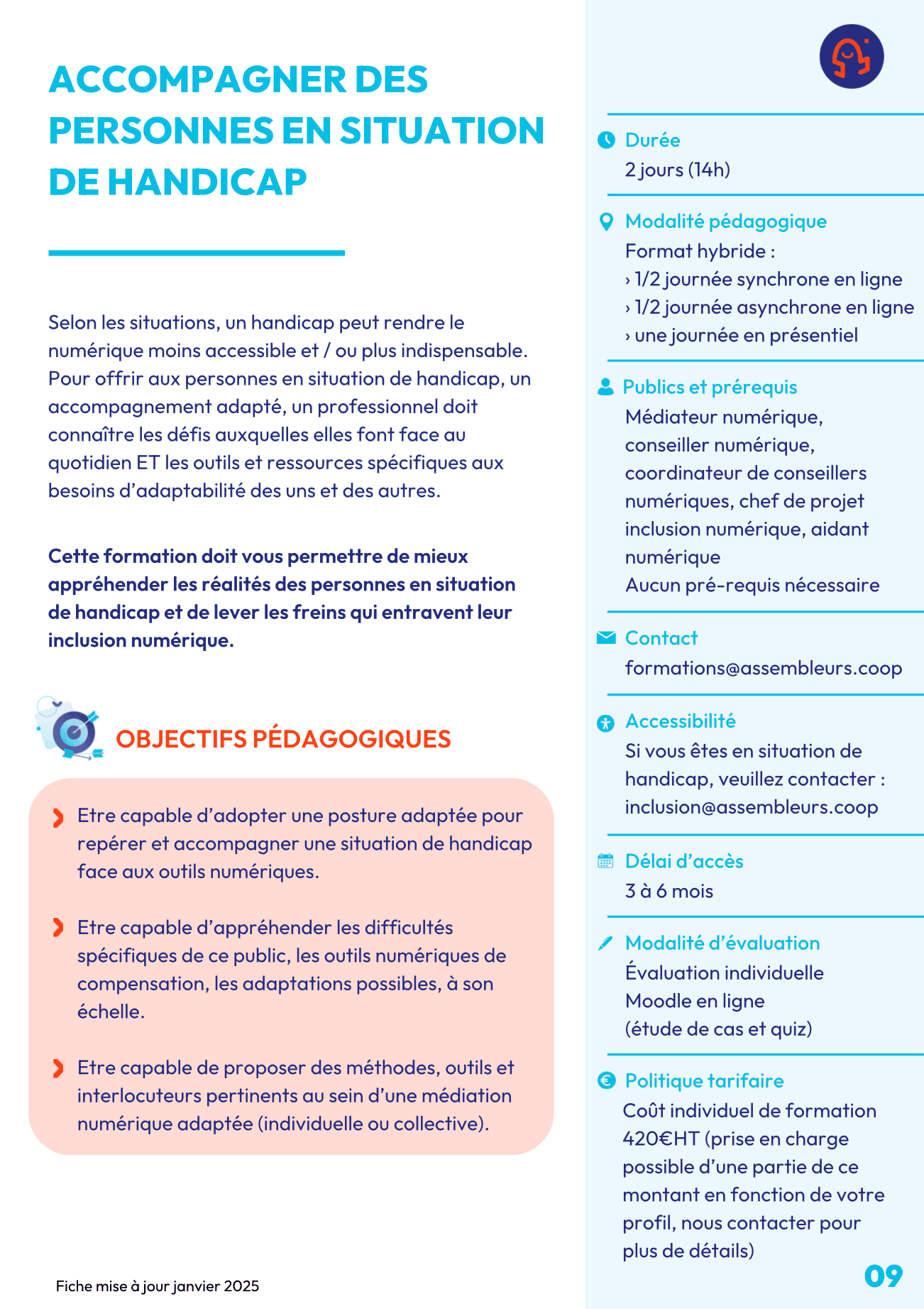 Objectifs de la formation : Cette formation doit vous permettre de mieux appréhender les réalités des personnes en situation de handicap et de lever les freins qui entravent leur inclusion numérique.