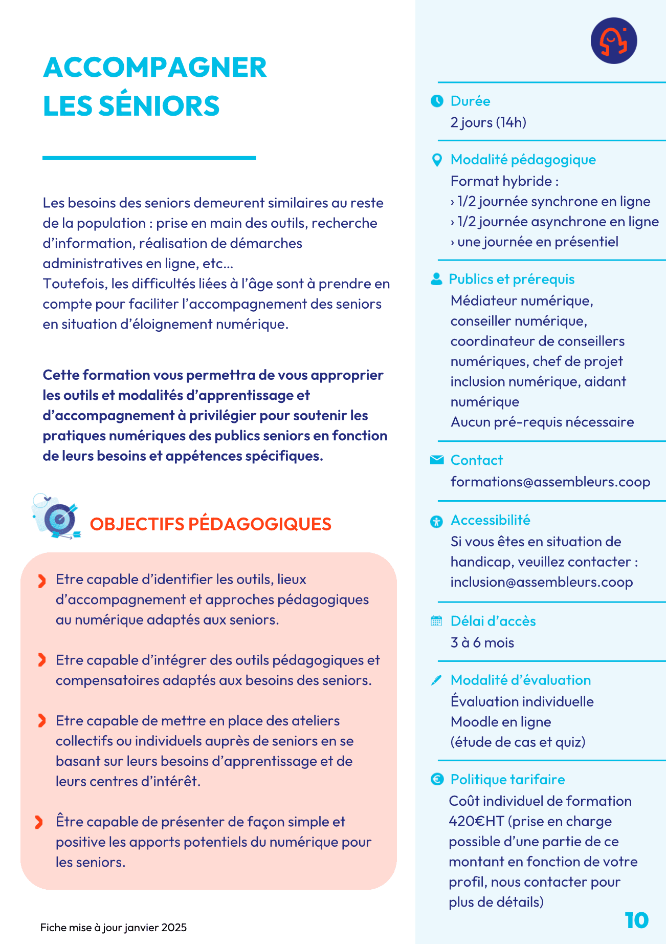 Objectifs de la formation : Cette formation vous permettra de vous approprier les outils et modalités d’apprentissage et d’accompagnement à privilégier pour soutenir les pratiques numériques des publics seniors en fonction de leurs besoins et appétences spécifiques.
