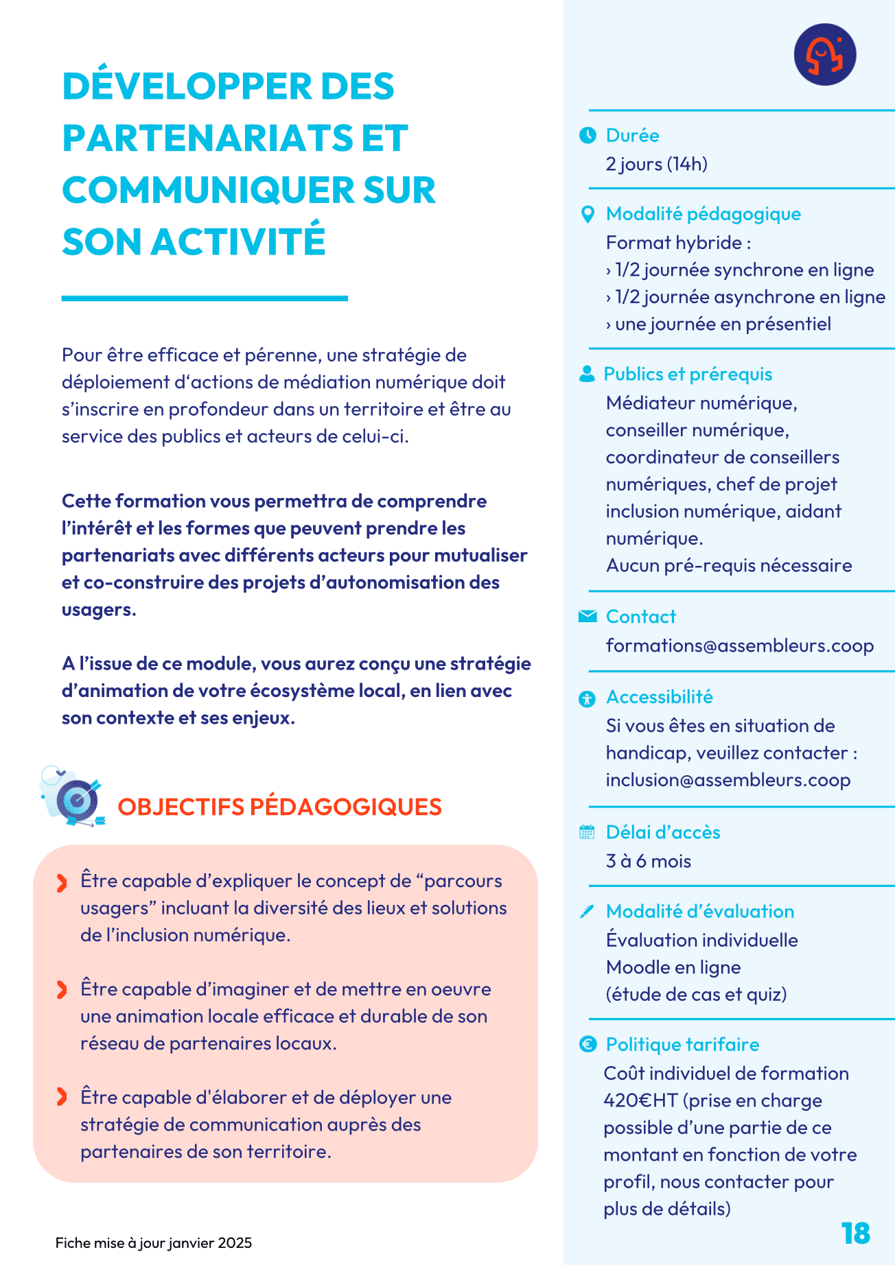 Objectifs de la formation : Cette formation permet aux coordinateurs de conseillers numériques d'inscrire leur rôle d'animation à une échelle plus large que la sphère des conseillers numériques. A l'issue de la formation, le coordinateur de conseillers numériques a renforcé ses capacités de mobilisation d'acteurs et d'animation de réseau, et est en mesure de créer du lien entre des enjeux et dispositifs sectoriels.