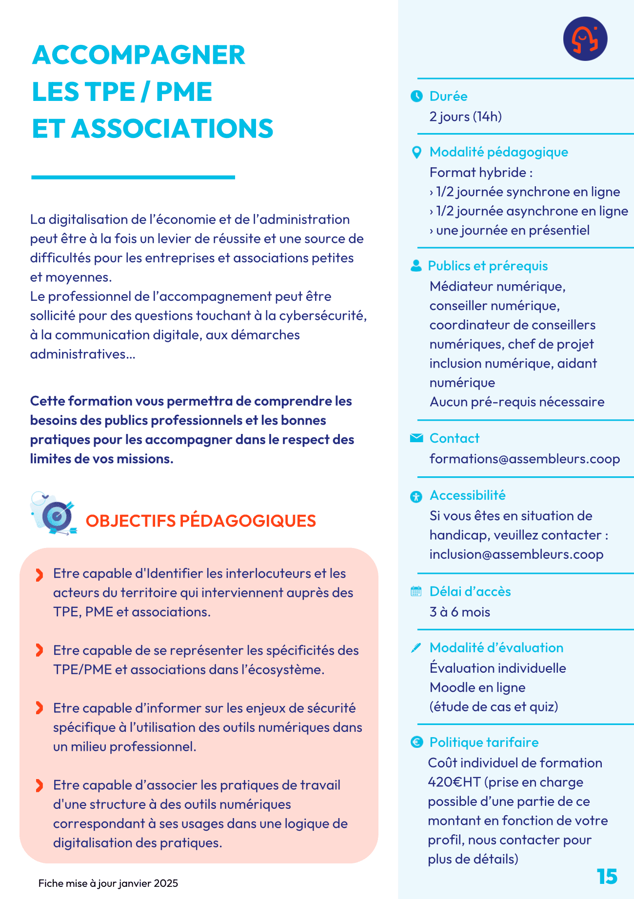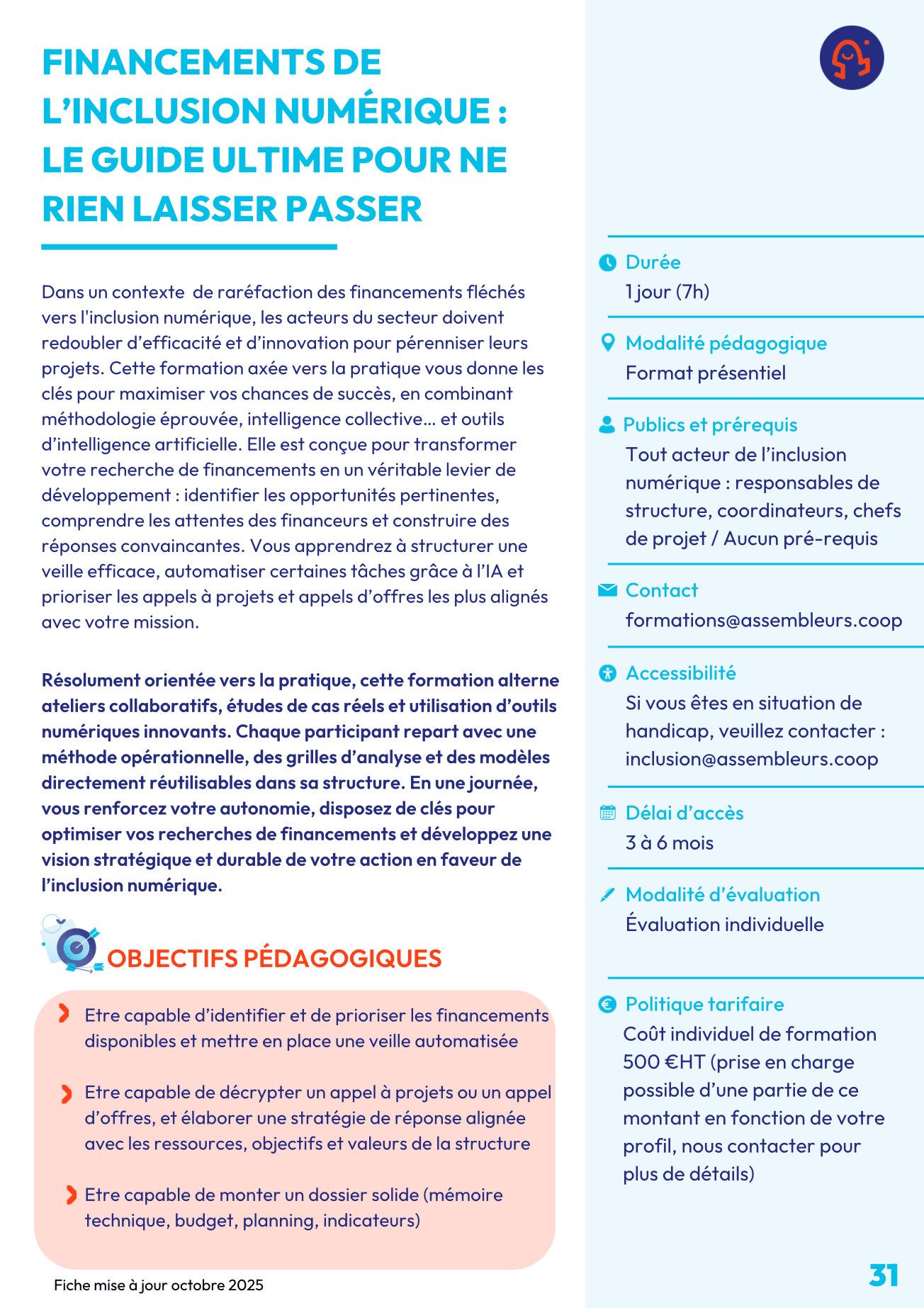 Objectifs de la formation : Résolument orientée vers la pratique, cette formation alterne ateliers collaboratifs, études de cas réels et utilisation d’outils numériques innovants. Chaque participant repart avec une méthode opérationnelle, des grilles d’analyse et des modèles directement réutilisables dans sa structure. En une journée, vous renforcez votre autonomie, disposez de clés pour optimiser vos recherches de financements et développez une vision stratégique et durable de votre action en faveur de l’inclusion numérique.