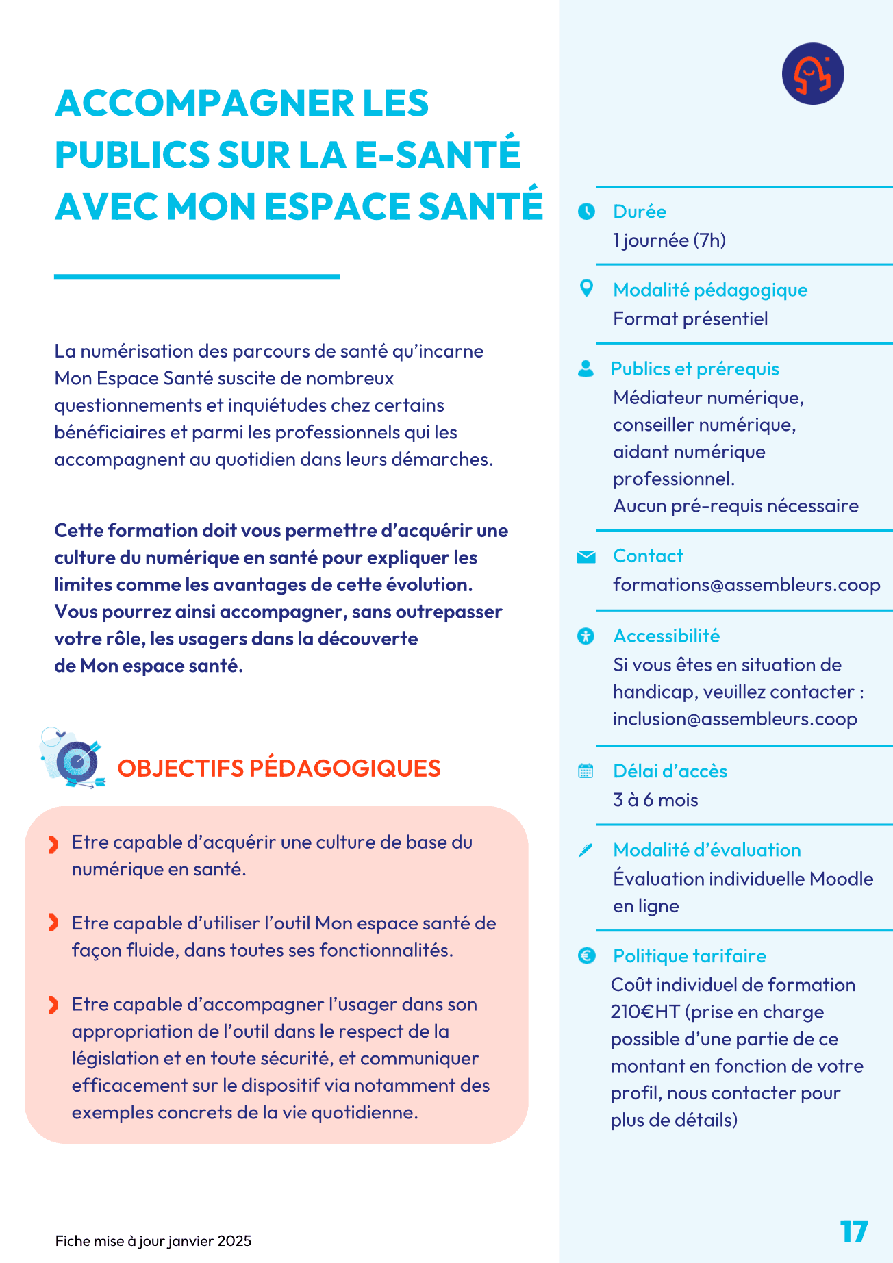 Objectifs de la formation : Cette formation doit vous permettre d’acquérir une culture du numérique en santé pour expliquer les limites comme les avantages de cette évolution. Vous pourrez ainsi accompagner, sans outrepasser votre rôle, les usagers dans la découverte de Mon espace santé.