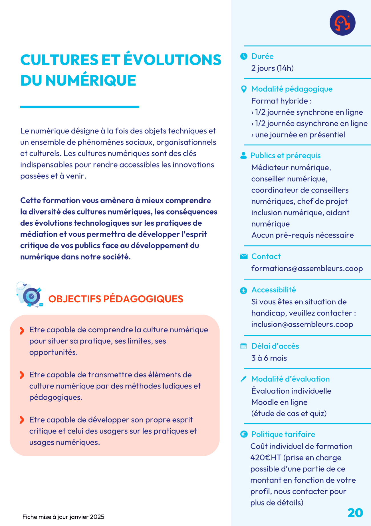 Objectifs de la formation : Cette formation vous amènera à mieux comprendre la diversité des cultures numériques, les conséquences des évolutions technologiques sur les pratiques de médiation et vous permettra de développer l’esprit critique de vos publics face au développement du numérique dans notre société.