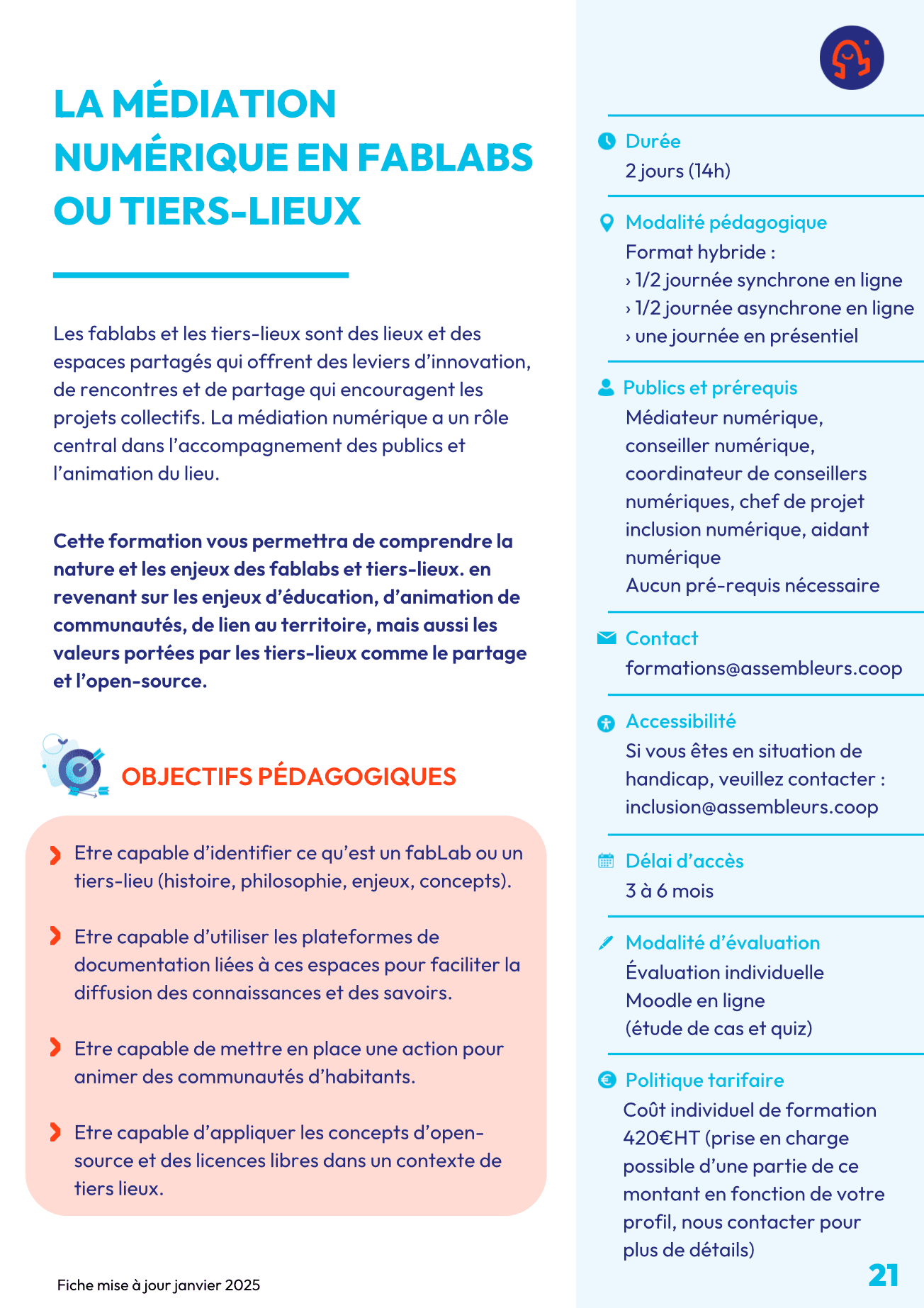 Objectifs de la formation : Cette formation vous permettra de comprendre la nature et les enjeux des fablabs et tiers-lieux. en revenant sur les enjeux d’éducation, d’animation de communautés, de lien au territoire, mais aussi les valeurs portées par les tiers-lieux comme le partage et l’open-source.