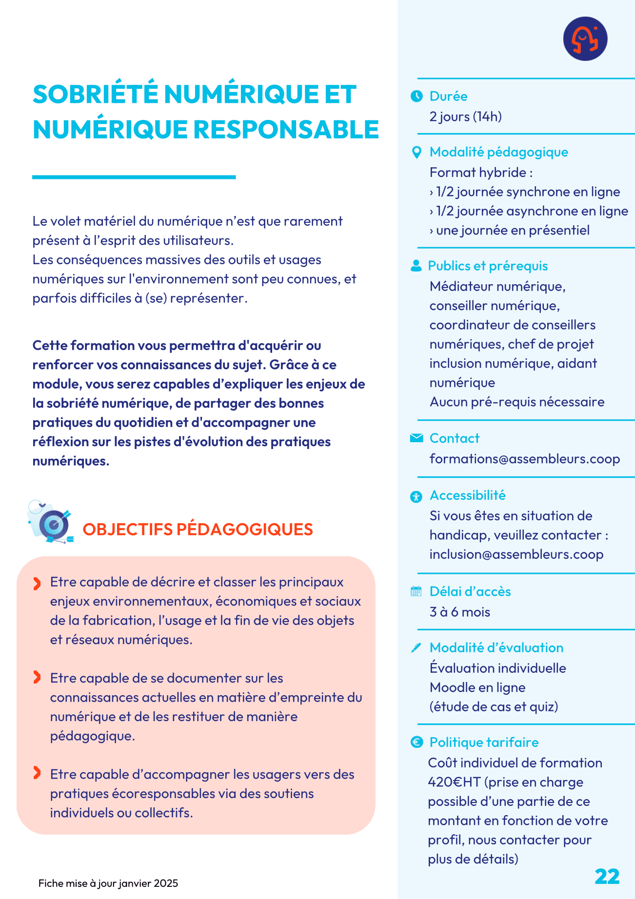 Objectifs de la formation : Cette formation vous permettra d'acquérir ou renforcer vos connaissances du sujet. Grâce à ce module, vous serez capables d’expliquer les enjeux de la sobriété numérique, de partager des bonnes pratiques du quotidien et d'accompagner une réflexion sur les pistes d'évolution des pratiques numériques.