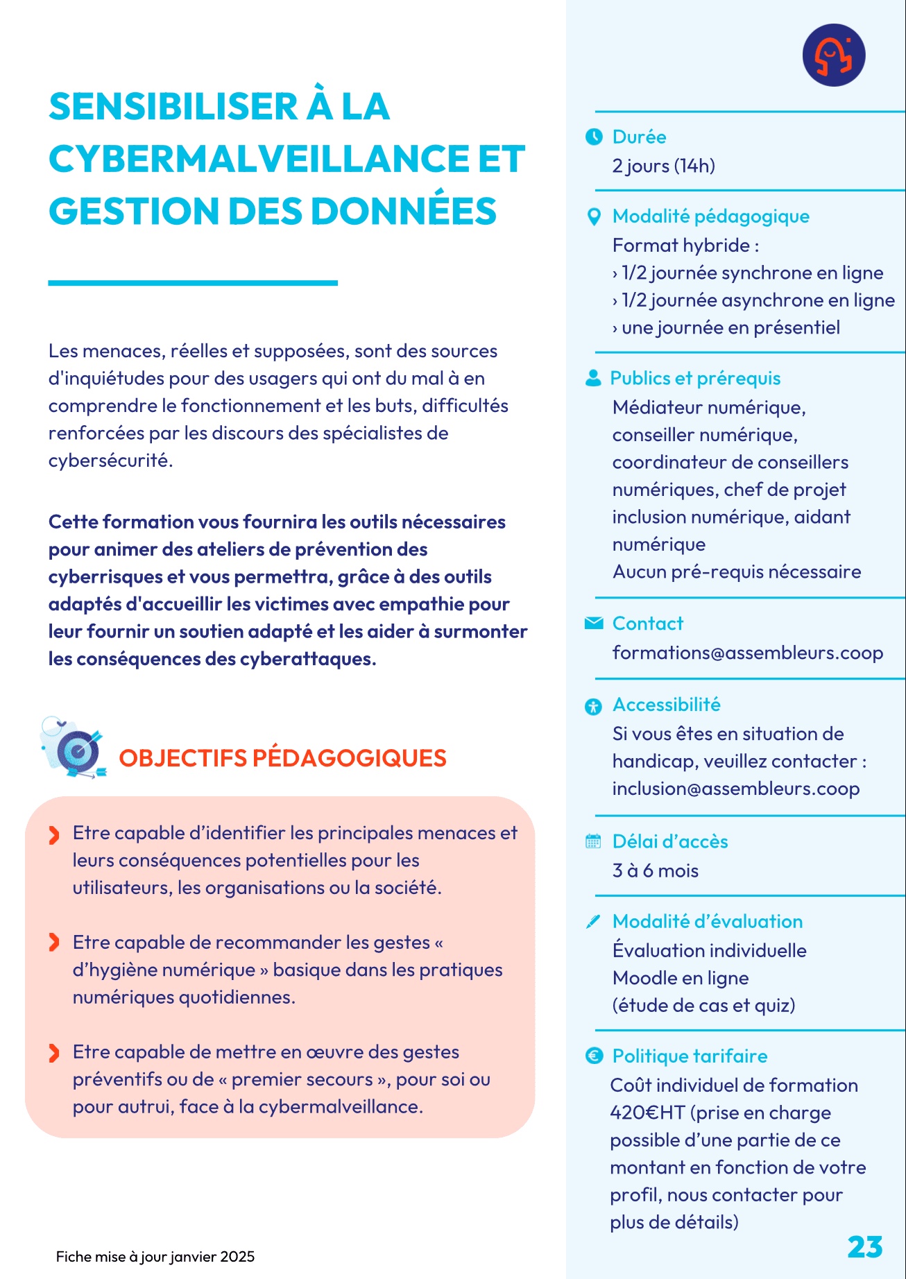 Objectifs de la formation : Cette formation vous fournira les outils nécessaires pour animer des ateliers de prévention des cyberrisques et vous permettra, grâce à des outils adaptés d'accueillir les victimes avec empathie pour leur fournir un soutien adapté et les aider à surmonter les conséquences des cyberattaques.
