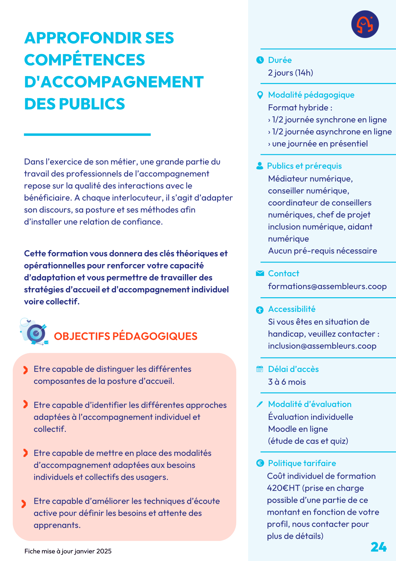 Objectifs de la formation : Cette formation apporte des réponses concrètes à ces questions en proposant des méthodes et outils adaptés. Les participants seront amenés à analyser leurs pratiques et à expérimenter des mises en situation pour renforcer leurs compétences d'accompagnement.