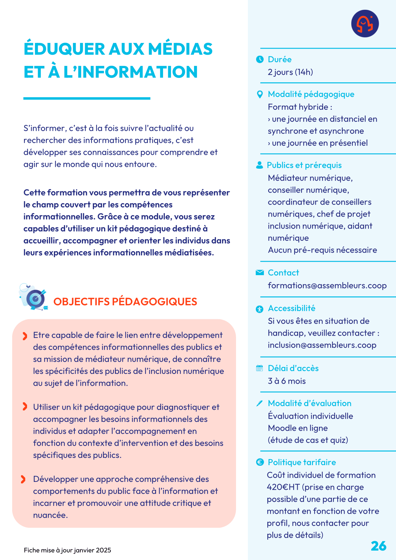 Objectifs de la formation : Cette formation vous permettra de vous représenter le champ couvert par les compétences informationnelles. Grâce à ce module, vous serez capables d’utiliser un kit pédagogique destiné à accueillir, accompagner et orienter les individus dans leurs expériences informationnelles médiatisées.