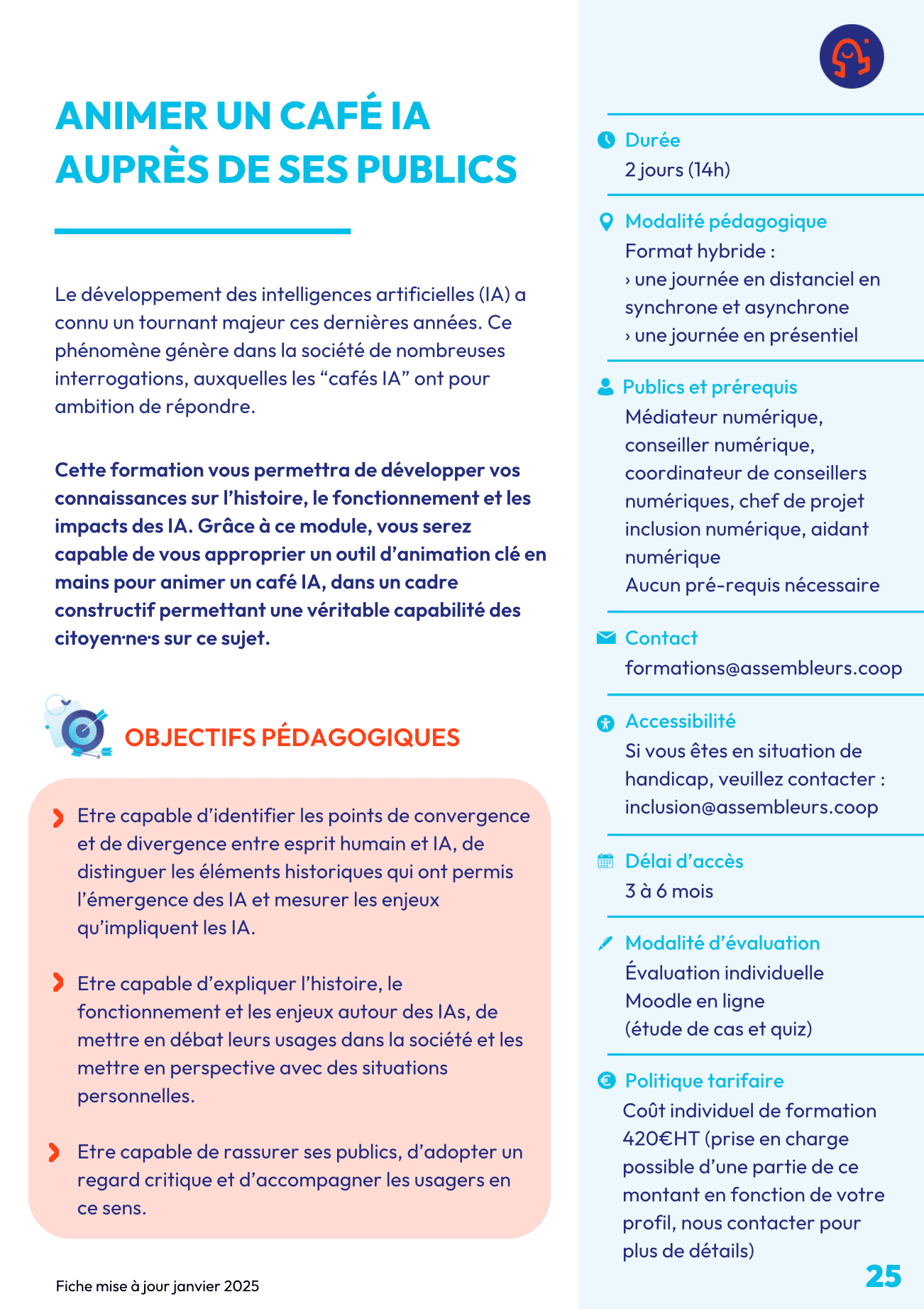 Objectifs de la formation : Cette formation vous permettra de développer vos connaissances sur l’histoire, le fonctionnement et les impacts des IA. Grâce à ce module, vous serez capable de vous approprier un outil d’animation clé en mains pour animer un café IA, dans un cadre constructif permettant une véritable capabilité des citoyen·ne·s sur ce sujet.