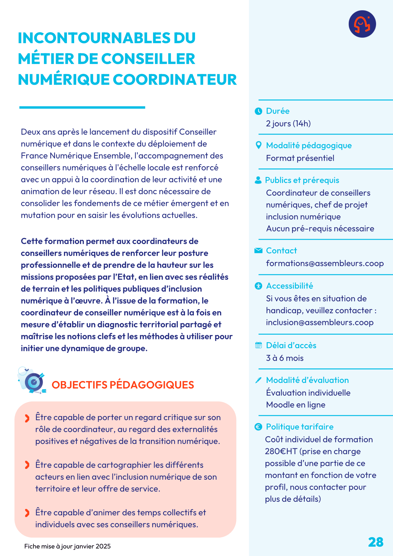 Deux ans après le lancement du dispositif Conseiller numérique et dans le contexte du déploiement de France Numérique Ensemble, l'accompagnement des conseillers numériques à l'échelle locale est renforcé avec un appui à la coordination de leur activité et une animation de leur réseau. Il est donc nécessaire de consolider les fondements de ce métier émergent et en mutation pour en saisir les évolutions actuelles.