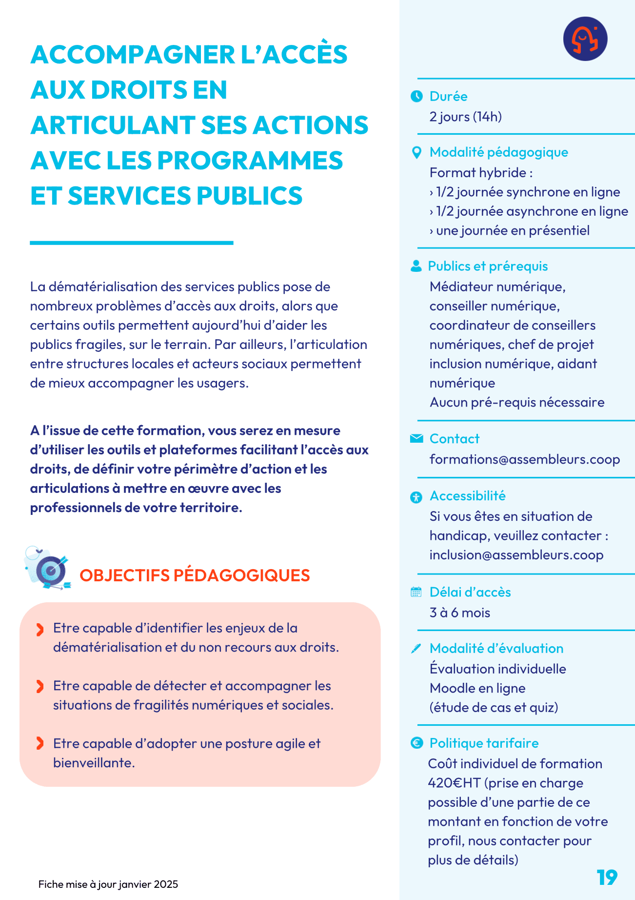 Objectifs de la formation : À l’issue de cette formation, vous serez en mesure d’utiliser les outils et plateformes facilitant l’accès aux droits, de définir votre périmètre d’action et les articulations à mettre en œuvre avec les professionnels de votre territoire.